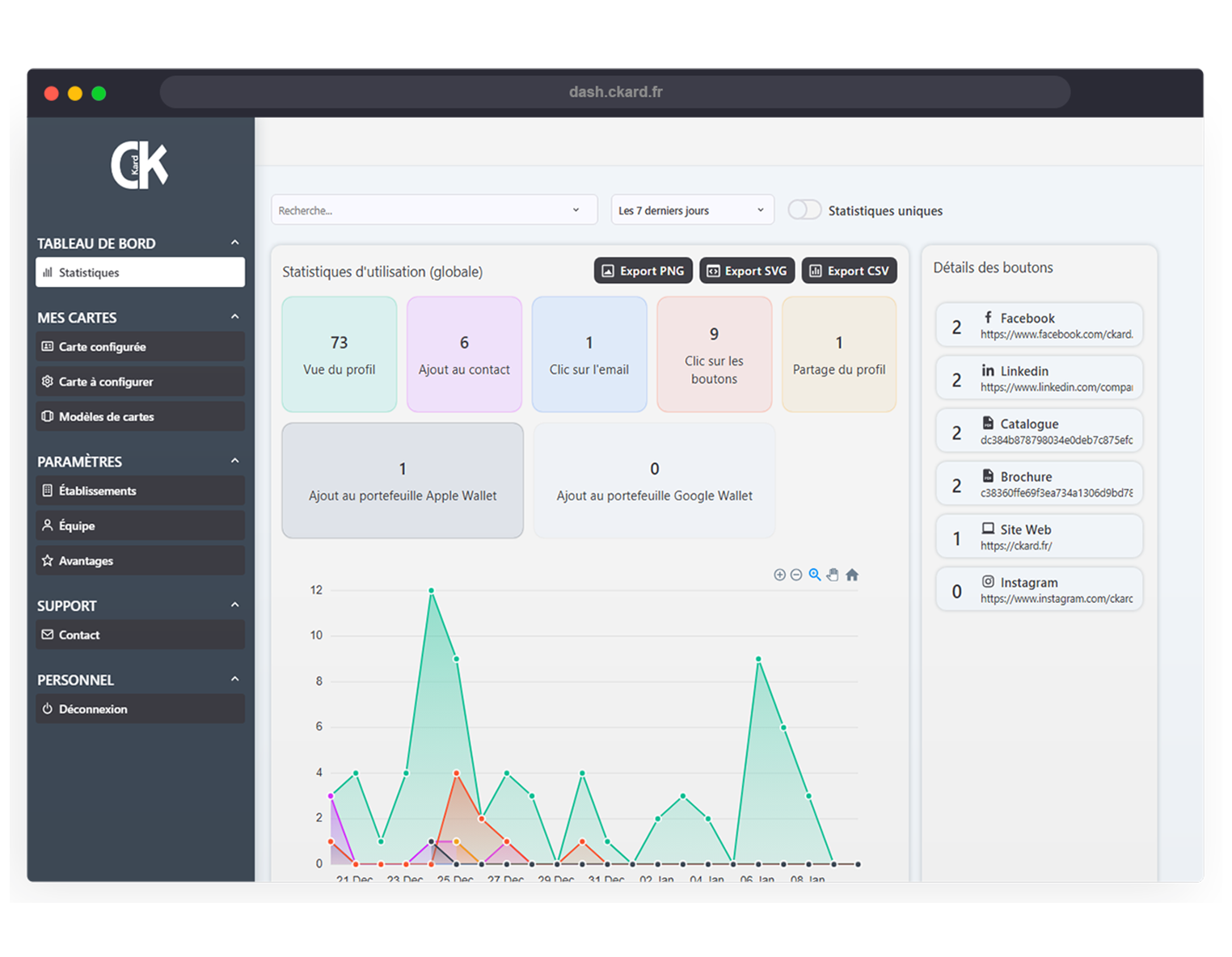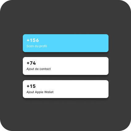 Le dashboard vous permet de suivre en temps réel les statistiques de vos cartes de visite : nombre de vues, clics sur les boutons, ajouts à Apple Wallet, et bien plus encore.